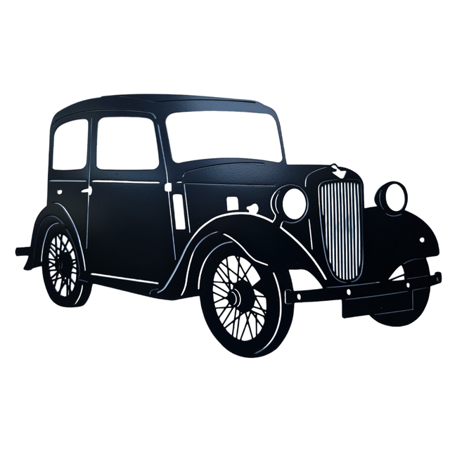 Add a classic touch to your space with this beautifully crafted Austin 7 Wall Art. Measuring 42cm wide by 27cm high, this durable piece is powder-coated on both sides with a sleek Satin Black finish, allowing for versatile double-sided display indoors or outdoors.