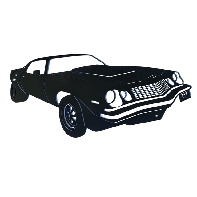 Add a bold statement to your space with this stunning Camaro metal Wall Art, measuring 42cm wide and 21cm tall. Designed and crafted in-house, this piece features a durable satin black powder coated finish on both sides, allowing versatile display options indoors or outdoors.