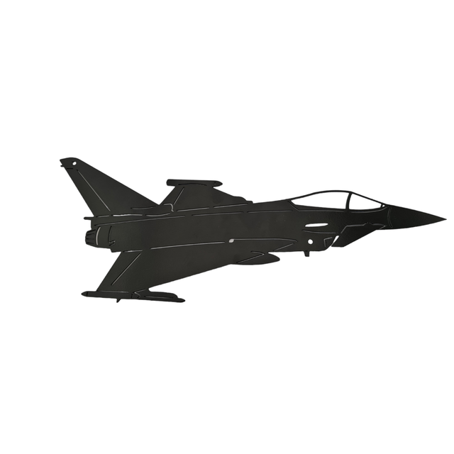 Showcase your passion for aviation with this meticulously crafted Eurofighter Typhoon model. Measuring 42cm from nose to tail with a 15cm wingspan, this metal fighter jet features a durable satin black finish achieved through powder coating on both sides, allowing versatile display options.