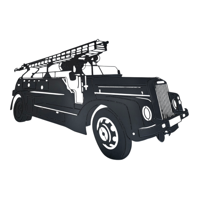 Add a charming touch to your home or garden with this expertly crafted metal Fire Truck Wall Art. Measuring 42cm wide by 32cm tall, it features a durable satin black powder-coated finish on both sides, allowing for versatile double-sided display indoors or outdoors.