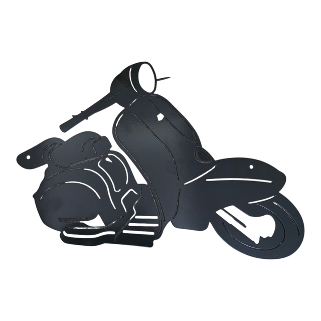 Add a stylish touch to any space with this meticulously crafted Lambretta metal Wall Art. Measuring 40cm wide by 26cm high, this durable piece features a sleek Satin Black powder-coated finish on both sides, allowing versatile display options.