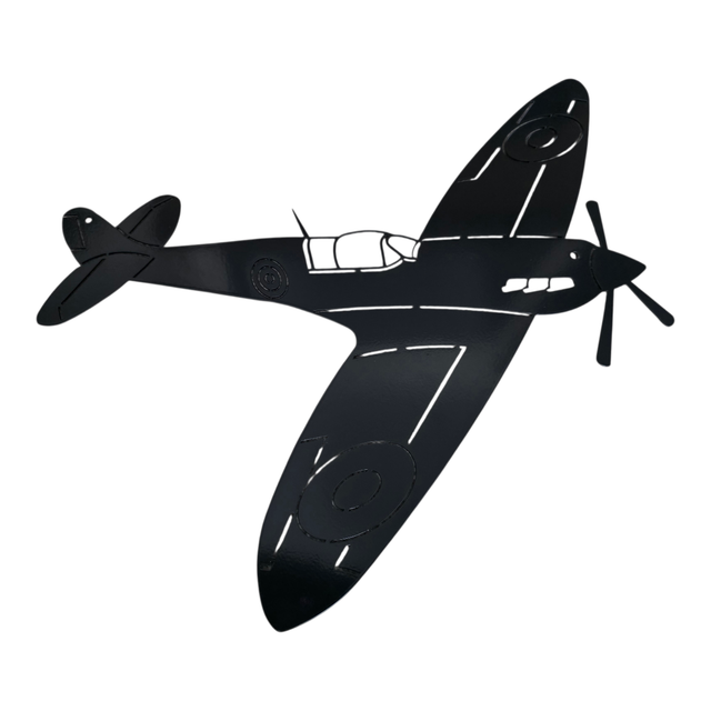 Celebrate aviation history with this meticulously crafted Spitfire metal Wall Art, measuring 41cm from propeller to tail with a 44.5cm wingspan. Designed and produced in-house, it features a durable satin black powder-coated finish on both sides, allowing versatile display options.